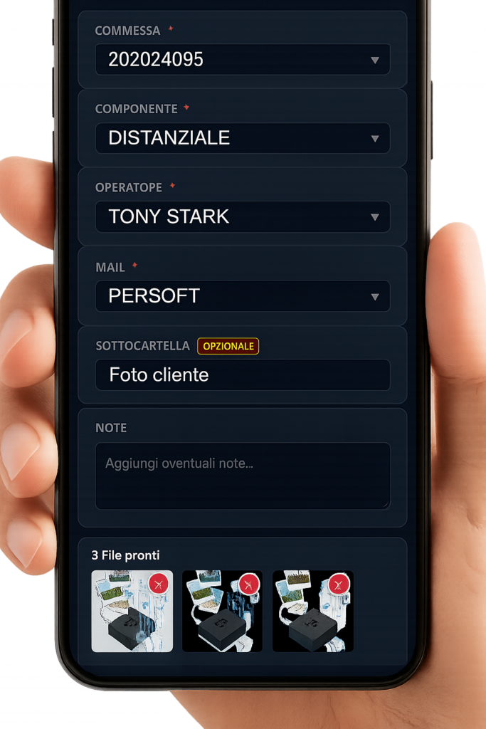 Ogni invio genera un report via email automatico agli interessati (configurabile dinamicamente), con le foto ridimensionate automaticamente per non appesantire la posta e un riepilogo dettagliato dei dati di commessa.